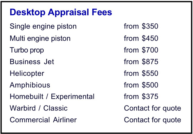 Our fees for providing aircraft appraisal, prebuy inspection, and title search services are based upon the aircraft type and model and the specific level of service requested.