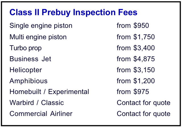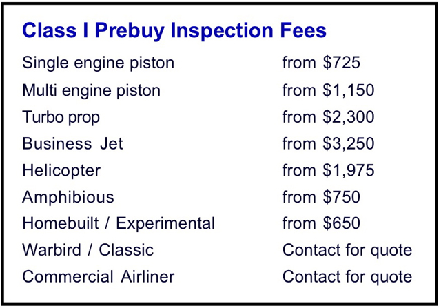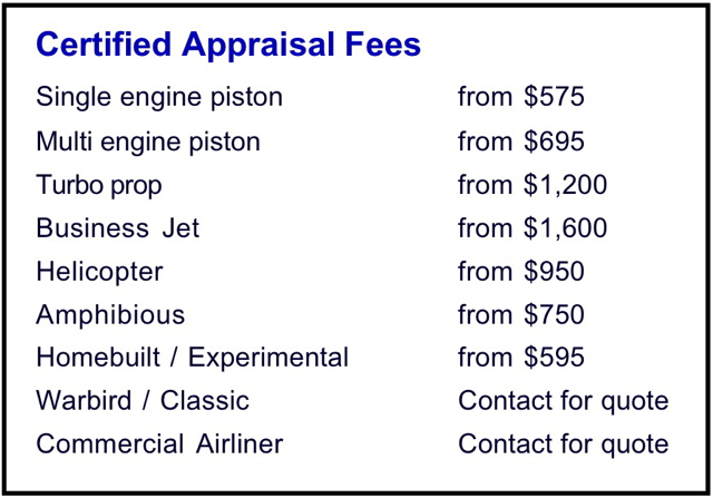 Our fees for providing aircraft appraisal, prebuy inspection, and title search services are based upon the aircraft type and model and the specific level of service requested.